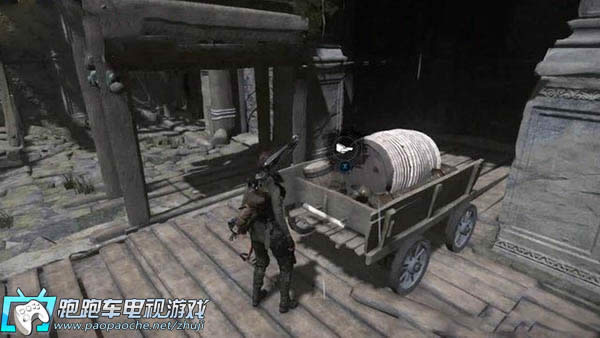 来到主场景庭院,藏宝室在庭院对面的二层。这里谜题的目标是利用两个配重锤来升起两只吊篮(平台),然后利用接通的路攀跳到藏宝室。
