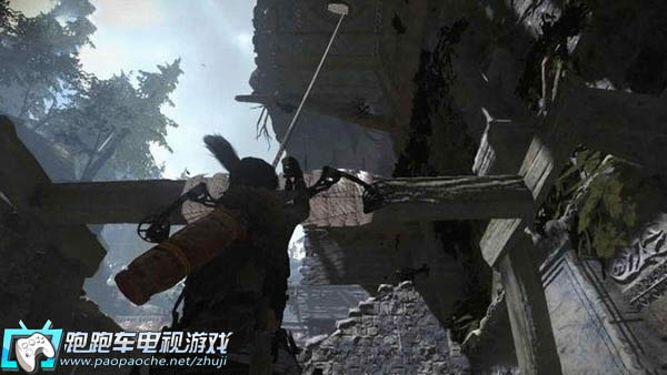 快速返回到小车前面,朝着落下的配重锤射箭,用绳索将它和小车绑到一起。这样,配重锤就悬在中间。