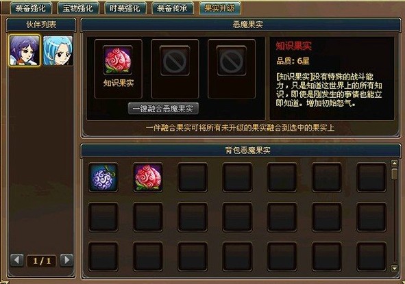 恶魔果实根据能提升伙伴的能力多少有星级划分,从1星到6星,果实所附带的能力越来越强。除此之外,恶魔果实还可以通过融合低等级的果实进行升级。等级越高,能提升的属性就会越多。想要最大程度施展恶魔果实的能力,不仅需要海贼们对症下药,选择最适合伙伴的果实,同时也要注意提升伙伴的恶魔果实等级。给恶魔果实升级,可以技术革新开强化面板-果实升级选项来进行果实升级,原理与宝石升级类似,将果实拖动到需要升级的果实上就可以让需要升级的果实获得经验了。一键融合恶魔果实会将背包中的品质差于选取中果实的其他所有果实快捷融合到选中果实上。