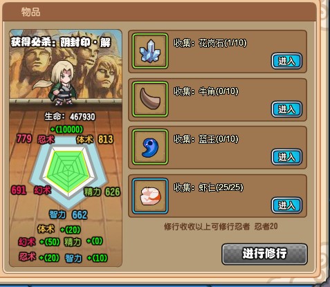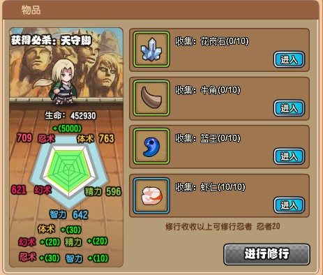 火影传说攒到了35w声望,可以招大奶!这里分享个骨灰级玩家的一些心得与游戏资料,临近40w声望之时不忘咨询,搜索纲手修行材料,记录下了材料到底有哪些,仅供还没有拿到纲手的玩家们参考,提前做好准备,节省一些体力。